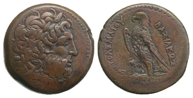 Ptolemaic Kingdom. Ptolemy II Philadelphos. 285-246 B.C. Æ hemiobol (29.8 mm, 22.56 g, 1 h). Alexandria, 266-256 B.C. Head of Zeus-Ammon right, wearing tainia / ΠTOΛEMAIOY BAΣIΛEΩΣ, eagle standing left on thunderbolt, Δ between legs. Svoronos 438; Weiser 34; SNG Cop 156. Fine.
