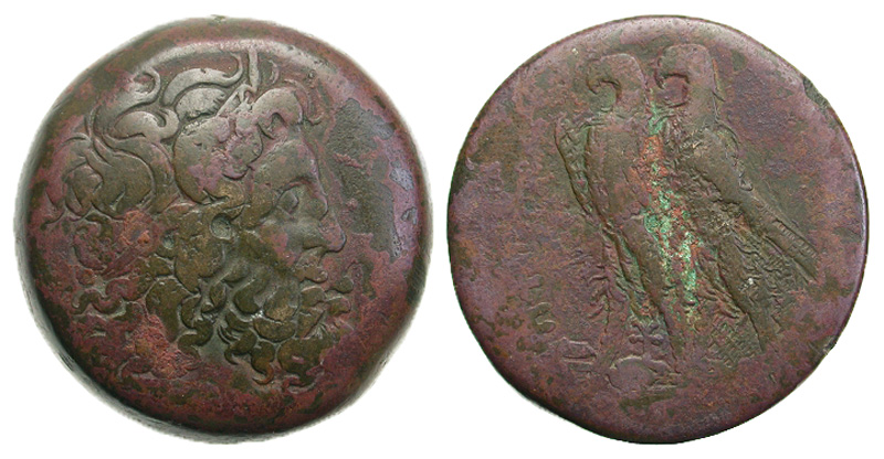 Ptolemaic Kingdom. Ptolemy III Euergetes. 246-222 B.C. Æ drachm (40.7 mm, 61.11 g, 11 h). Alexandria, 263-262 B.C. Head of Zeus-Ammon right, wearing tainia / ΠTOΛEMAIOY BAΣIΛEΩΣ, two eagles standing left on thunderbolt, TY monogram between legs. Svoronos 504; Weiser 23; SNG Cop 150. Fine.