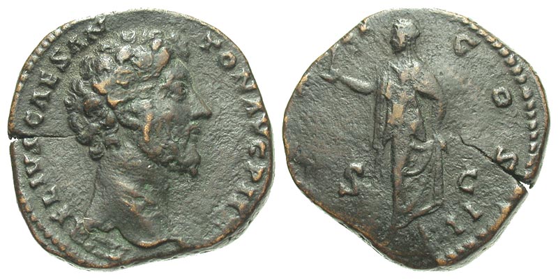 Lot 16-148. Marcus Aurelius. As Caesar, A.D. 138-161. Æ as. Rome mint, A.D. 157-158. Ex Dave Surber collection.