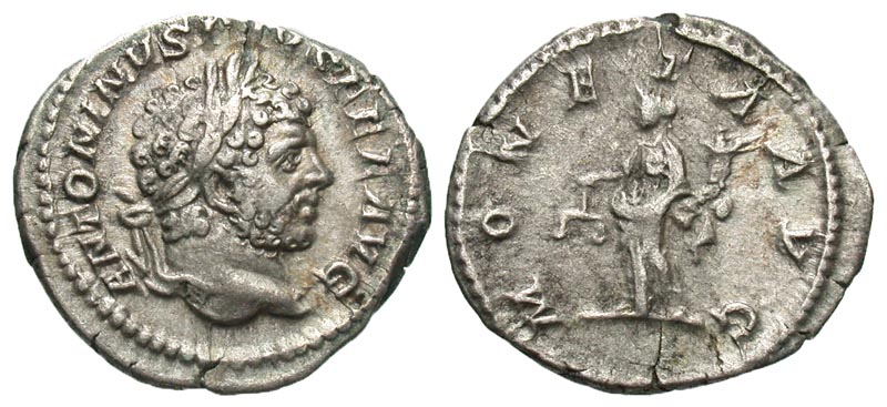 Caracalla. A.D. 198-217. AR denarius (19.7 mm, 2.99 g, 5 h). Rome, A.D. 213. ANTONINVS PIVS FEL AVG, bearded and laureate head right / MONETA AVG, Moneta standing left, holding scales and cornucopia. RIC 236; BMCRE 62; RSC 166. VF.