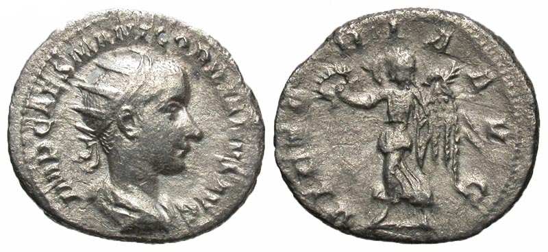 Gordian III. A.D. 238-244. AR antoninianus (22.3 mm, 3.63 g, 12 h). Rome mint, A.D. 238-239. IMP CAES M ANT GORDIANVS AVG, radiate, draped and cuirassed bust right / VICTORIA AVG, Victory advancing left, holding wreath and palm. RIC 5; RSC 357. aVF.