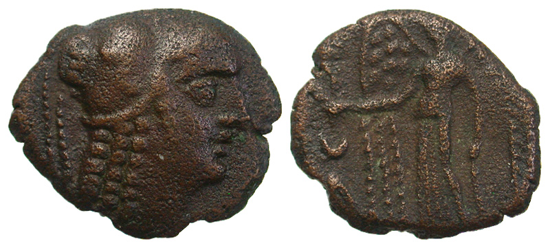 Nabataean Kingdom. Anonymous. 3rd–2nd centuries B.C. Æ quarter unit (19.2 mm, 3.51 g, 11 h). Petra?. Helmeted head of Athena right / Nike advancing left, holding wreath and cornucopia; crescent to left. Meshorer 1a; HGC 671. aVF.