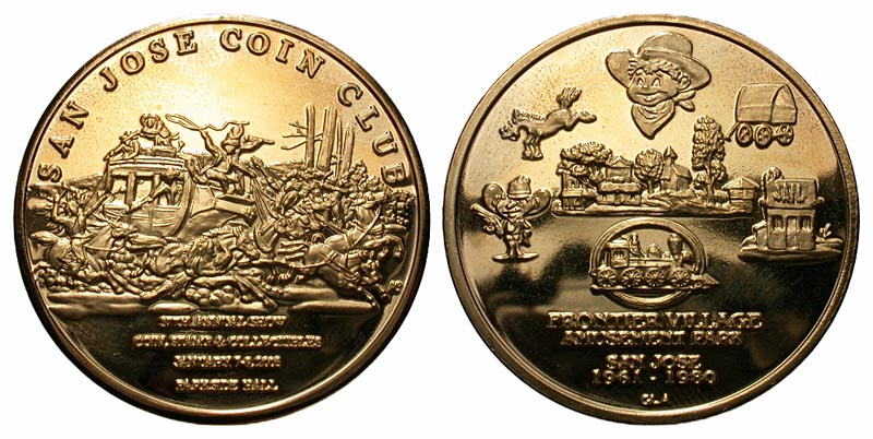 Lot 16-235. San Jose Coin Club. Frontier Village. CU token (gold plated). Ex Dave Surber collection.