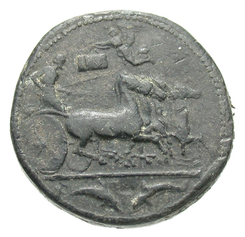Sicily, Syracuse. Second Democracy. 466-405 B.C. PB tetradrachm (23.9 mm, 17.20 g). UNIFACE LEAD / ROSA OFF-METAL TRIAL STRIKE. Charioteer, holding kentron in right hand and reins in left, driving fast quadriga right; above, Nike flying left, holding wreath with small tablet inscribed EYAIN/ETO in two lines; in exergue, two dolphins / Uniface. cf. BMC 188; CD-159v2. VF.