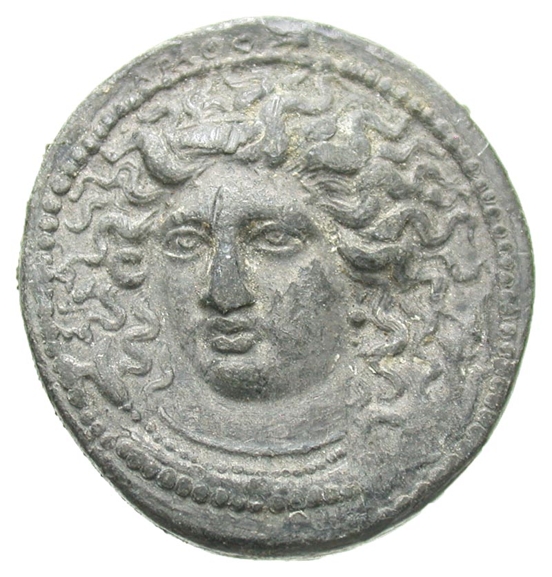 Sicily, Syracuse. Dionysios I. 405-367 B.C. PB tetradrachm (27.8 mm, 21.89 g). UNIFACE LEAD / ROSA OFF-METAL TRIAL STRIKE. APEΘOΣA in obverse margin, Head of Arethusa facing slightly left, wearing ampyx signed KIMΩN, earring and necklace; four dolphins swimming among tresses of hair / Uniface, cf. BMC 208; CD-165vb. aVF.