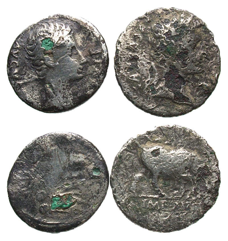 Lot of 2 Augustus Fourrée Denarii. Two Augustus fourrée denarii; IMP X - bull butting reverse, two soldiers with emperor. Fine condition.