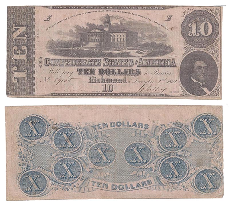 Lot 16-284. Confederate States of America, 10 Dollar Note, 1862. VF.