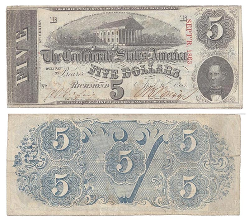 Confederate States of America, 5 Dollar Note, 1863. 1864, 5 dollar note. State capital at Richmond, VA, portrait of C.G. Memminger to right, beige background. Richmond, VA / Blue note, V five 5s. Book value is $108 in Good. One small crease, minor edge wear. Type 60, Criswell 448-469. VF.