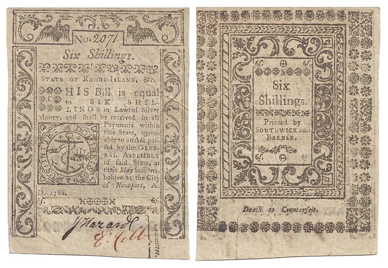 Lot 16-286. Colonial Currency; Rhode Island, Six Shillings, 1786.
