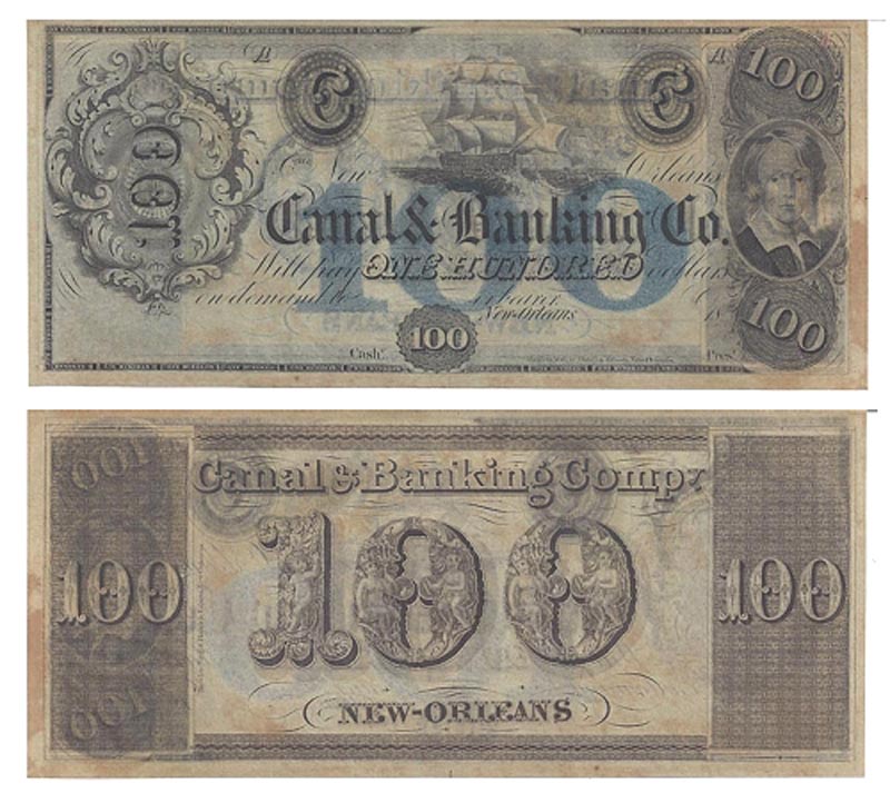 Obsolete Currency: Canal & Banking Co, 100 Dollars, New Orleans, 1850s. Large sailing ship, portrait of a young boy to right / Fancy reverse. Extremely fine; no creases or stains, crisp corners. A beautiful specimen. Unsigned and undated.