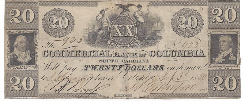 Lot 16-292. Obsolete Currency: Commercial Bank of Columbia, South Carolina, 20 Dollars, 1850.