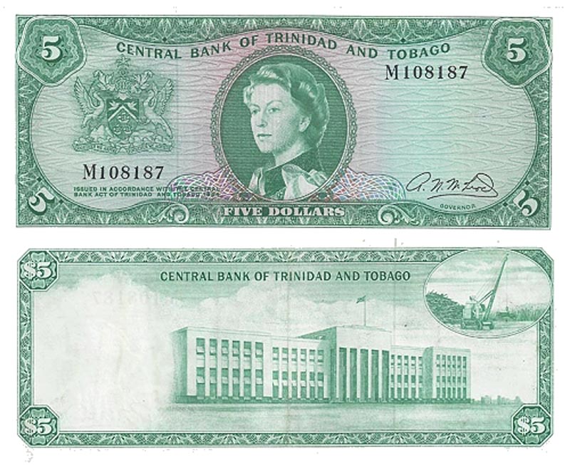 Trinidad and Tobago, Five dollars, 1964. Scarce. Bust of young Queen Elizabeth II left / Central bank of Trinidad and Tobago. Gem crisp. P27b.