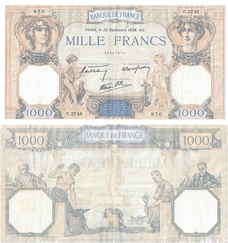 France, 1000 Francs, 1938. Heads of Ceres and Mercury / Four men representing different professions. A large note (9 1/8 x 5 1/8 inches). Minor creasing and stains. P 90C.