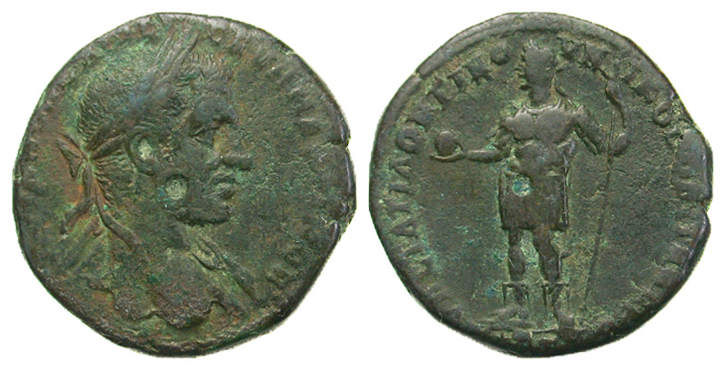 Moesia Inferior, Nicopolis ad Istrum. Macrinus. A.D. 217-218. Æ tetrassarion (26.1 mm, 12.59 g, 6 h). A.D. 217-218. Statius Longinus, magistrate. AVT K M OΠEΛ CEVH MAKPEINOC , laureate head right, draped left shoulder / VΠ CTA ΛONΓINOV NIKOPOΛITΩN ΠPOC IC, emperor standing left, holding globe and long scepter. AMNG 1783; Varbanov 3456; Hristova & Jeckov 8.23/34.5 var (cuirassed bust). Fine.