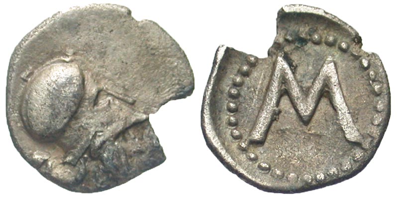 ARKADIA, Mantineia. 330-320 BC. AR Obol (0.79 gm). Head of Athena in Corinthian helmet / M in circle of pellets. BCD.1483. VF, edge split. Very Rare, ex. BCD Collection.