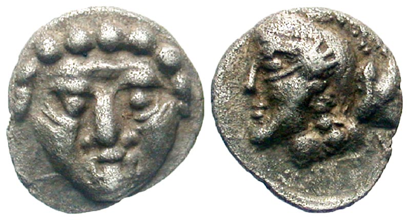 PISIDIA, Selge. c. 350-300 BC. AR Obol (0.94 gm). Facing head of Gorgon / helmeted head of Athena, with knuckle-bone behind. SNG.Fr.3.1928. Toned VF.