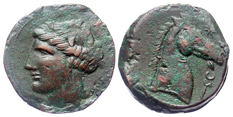 ZEUGITANIA, Carthage. 264-241 BC. AE29 (14.75 gm). Sardinian mint?. Head of Tanit left, wearing wreath / Horse's head right; star; below, caduceus. SNG.Cop.197. VF, brown patina. Scarce.