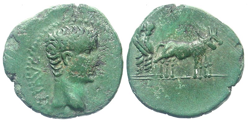 MACEDONIA, Philippi. Tiberius, 14-37 AD. AE16 (2.94 gm). Bare head of Tiberius / Two priests ploughing with two oxen. RPC.1657. VF, green patina. Choice.