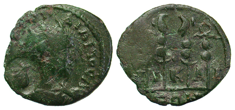 Bithynia, Nicaea. Gordian III. A.D. 238-244. Æ assarion (19.8 mm, 2.55 g, 6 h). M ANT GOPDIANOC AVG, radiate, draped and cuirassed bust right; c/m: head in circle / N-I-K-A-I-EΩN, two eagle topped standards between two wreathed topped standards. Rec Gen 712; Howgego 65. Fine, sharp countermark.