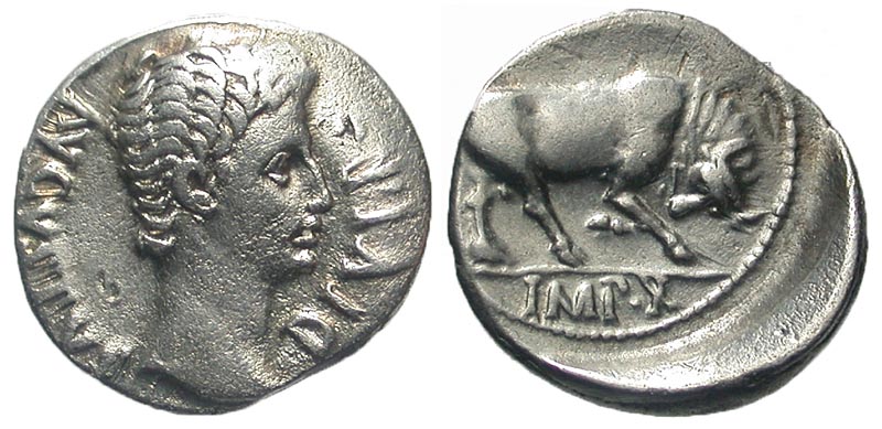 AUGUSTUS, 27 BC-14 AD. AR Denarius (3.69 gm). Bare head / Bull butting. RSC.137. RIC.167a. Toned VF+. Scarce.
