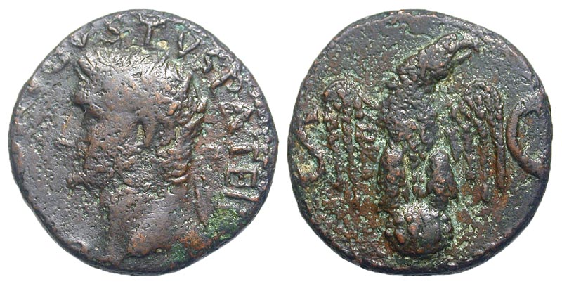 AUGUSTUS, 27 BC-14 AD. AE As (11.45 gm). Radiate head left / Eagle on globe facing. RIC.82(Tib). aVF, brown patina. Scarce.