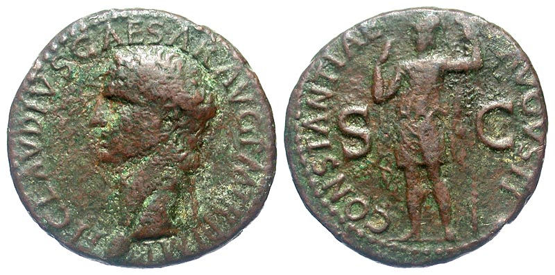 CLAUDIUS, 41-54 AD. AE As (10.46 gm), 41-3. Bare head / Constantia in military dress, standing holding spear. RIC.95. Fine+, olive brown patina.