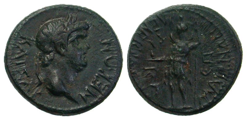 Lydia, Maeonia. Nero. A.D. 54-68. Æ 16 (15.6 mm, 2.83 g, 1 h). A.D. 65. Menekrates, magistrate. NEPΩN KAICAP, laureate head right / MAIONΩN, Men standing left, holding pine cone and scepter. RPC 3015; BMC 35; Lindgren 751. EF.