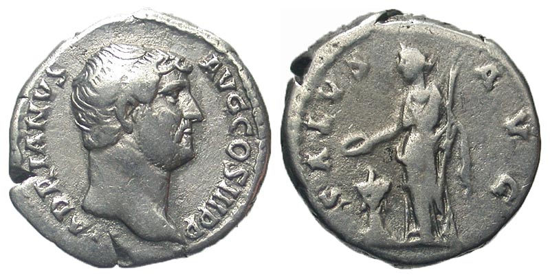 HADRIAN, 117-138 AD. AR Denarius (3.50 gm). Bare head / Salus standing sacrificing at altar. RSC.1328. RIC.268. VF.