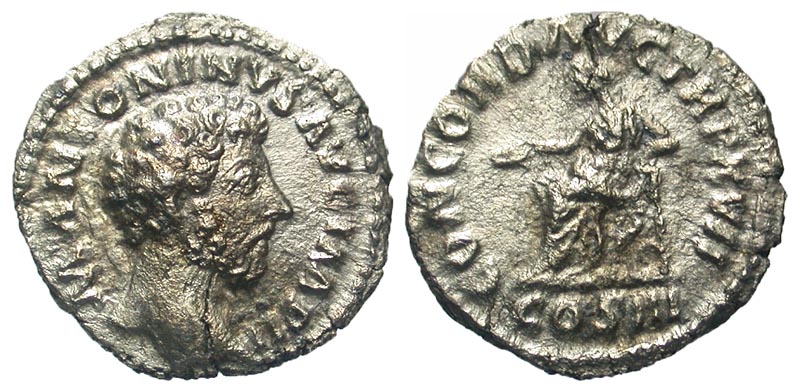 MARCUS AURELIUS, 161-180 AD. AR Denarius (2.57 gm). Bare head / Concordia seated holding patera and resting arm on statue of spes. RIC.58. VF+, even porosity.