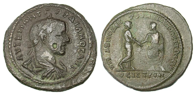 Moesia Inferior, Nicopolis ad Istrum. Gordian III. A.D. 238-244. Æ tetrassarion (29.9 mm, 11.57 g, 7 h). Sabinius Modestus, magistrate. A.D. 241-244. AVT K M ANT ΓOPΔIANOC AVΓ, laureate, draped, and cuirassed bust right / YP CAB MOΔЄCTOY NIKOΠOΛЄITΩN ΠPOC ICTPON, Marriage scene. Gordian and Tranquillina standing facing each other, holding hands. AMNG 2096; Varbanov 4200; H&J 8.36.34.5. aVF, Rare, slight double strike on the obverse.