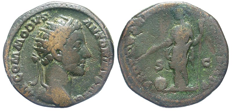 COMMODUS, 180-192 AD. AE Dupondius (11.12 gm). Laureate head / Providentia standing with baton and cornucopiae, globe at feet. RIC.389. Toned aVF, olive brown patina.