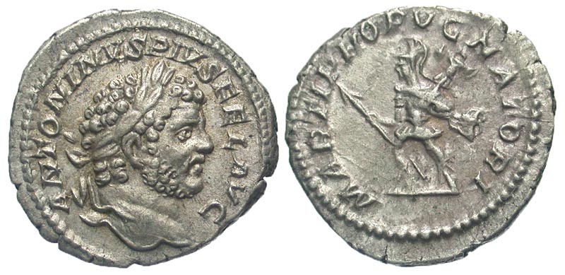 CARACALLA,198-217 AD. AR Denarius (3.11 gm). Laureate head / Mars advancing with spear and trophy. RIC.235(S). Toned aXF.