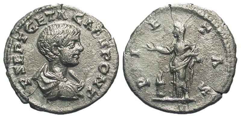 GETA, 209-212 AD. AR Denarius (2.42 gm), Laodicea ad Mare, as Caesar, 200-2. Draped boy's bust / Pietas standing sacrificing over altar. RIC.99. RSC.97. VF+.