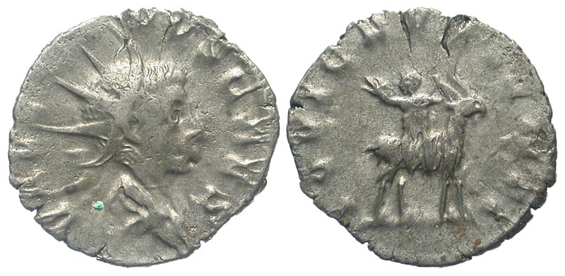 VALERIAN II, d. 255 AD. AR Antoninianus (2.28 gm), Lugdunum. Radiate draped bust / Jupiter as child seated on goat. RIC.3. Toned aVF, weak obv strike.