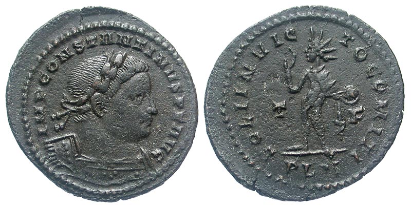CONSTANTINE I the GREAT, 307-337 AD. AE Large Module Follis (4.12 gm) of London, 310 AD. Laureate ciuirassed bust / Sol Invictus standing holding globe. RIC.121a. VF+, dark brown patina.