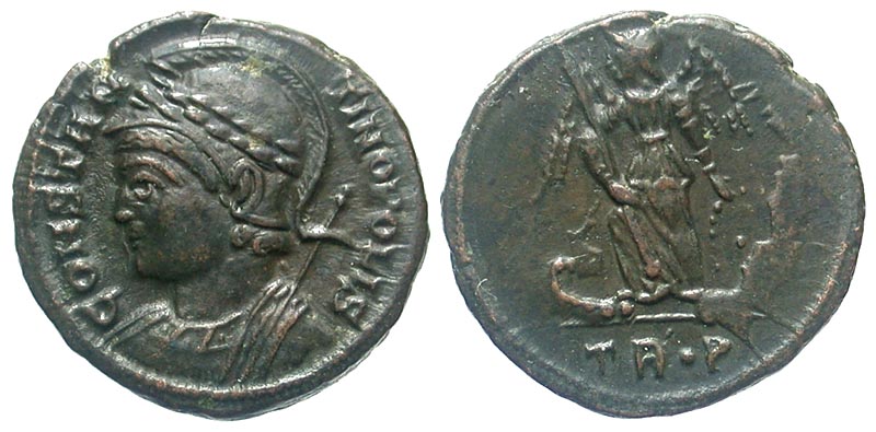 CONSTANTINOPOLIS, 330-340 AD. AE Follis (2.50 gm) of Trier, 330/1. Armoured bust of Constantinopolis / Victory standing on prow. RIC.543. Near Mint, brown patina.