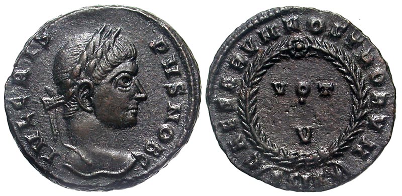 CRISPUS, d. 326 AD. AE Follis (3.06 gm), Siscia, 323-4. Laureate head / Wreath with votive inscription. RIC.161. Near Mint, brown patina.
