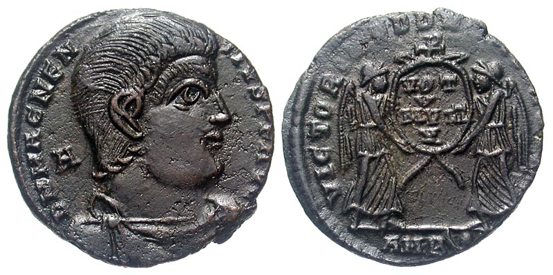 MAGNENTIUS, 350-353 AD. AE Centenionalis (4.01 gm) of Amiens. Draped and cuirassed bust / Two Victories holding shield with votive inscription with Christogram above. RIC.25(S). XF, brown black patina. Scarce. Part of the BridgNorth Hoard found in Shropshire in 2007.