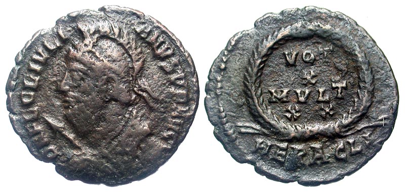 JULIAN II the APOSTATE, 360-363 AD. AE Follis (2.69 gm) of Heraclea. Helmeted bust with spear and shield / Wreath with votive inscription. RIC.106. LRBC.1909. Fine+, brown patina.