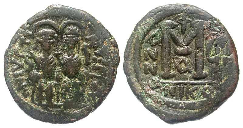 BYZANTINE EMPIRE. Justin II, 565-578 AD. AE Follis (12.98 gm) of Nikomedia, yr. 7, A. Justin and Sophia enthroned / Large M. S.369. aVF, dark green patina.