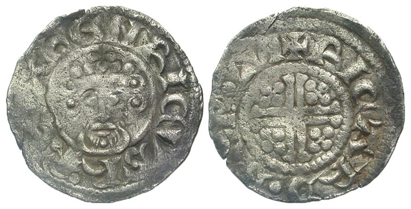 ENGLAND. John Lackland, 1199-1216 AD. AR Penny (1.19 gm) of London, class 5b2. RICARD B ON LVN. Crowned bust facing holding sceptre / Short cross with crosslets in angles. S.1351. Mass.1423. Toned aVF. ex Jim Sazama coll.