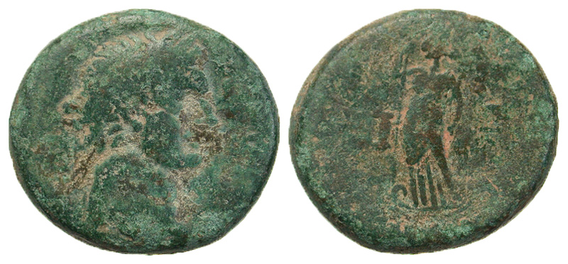 Judaea, Ascalon. Hadrian. A.D. 117-138. Æ 24 (24.0 mm, 13.09 g, 1 h). Laureate and draped bust right / Tyche-Astarte standing left on galley, holding scepter and aplustre; altar to left; to right, dove left above [date]. SNG Cop 40; cf. Roseberger 150. VG, green patina.