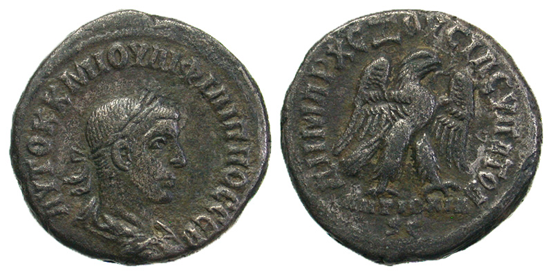 Syria, Seleucis and Pieria. Antiochia ad Orontem. Philip II. A.D. 247-249. BI tetradrachm (25.8 mm, 12.61 g, 6 h). A.D. 249. AVTOK K M IOVΛI ΦIΛIΠΠOC CEB, laureate, draped, and cuirassed bust right / ΔHMAPX EΞOVCIAC VΠATO Δ, ANTIOXIA SC, eagle standing right, holding wreath in beak, with wings spread. Prieur 474; SNG Cop 268 corr (Philip I). aVF.