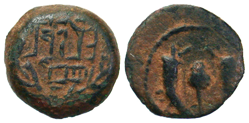 Alexander Jannaeus. 103-76 B.C.E. Æ prutah (12.8 mm, 2.00 g, 11 h). Barbarous Imitation. Legend within wreath / Double cornucopia adorned with ribbons, pomegranate between horns. cf. Hendin 1144; cf. Meshorer TJC Q. EF, attractive red patina.