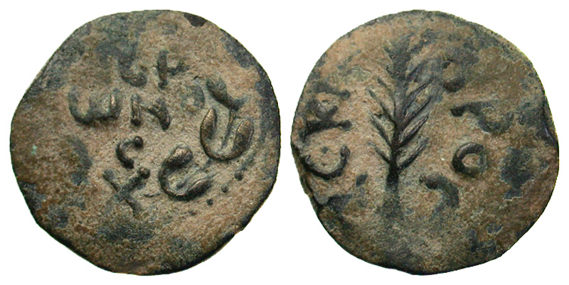 Porcius Festus. 59-62 C.E. Æ prutah (17.0 mm, 2.28 g, 0 h). Procurator under Nero. NEPWNOC, legend within wreath, bottom tied with X / LE KAICAPOC, palm branch. Hendin 1351; Meshorer TJC 345. aVF, sandy patina.