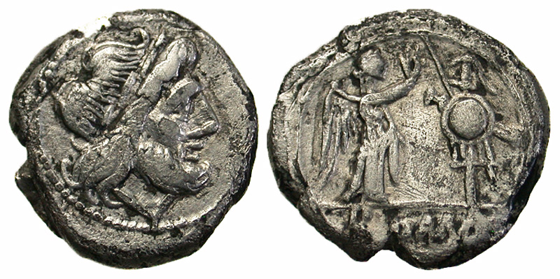 Anonymous. after 211 B.C. AR victoriatus (16.9 mm, 2.73 g, 9 h). Rome. Laureate head of Jupiter right / ROMA, Victory standing right, crowning trophy. Crawford 53/1; Sydenham 83; RSC 9. Fine.