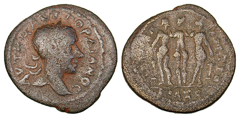 Cilicia, Anazarbus. Gordian III. A.D. 238-244. Æ 21 (20.5 mm, 6.52 g, 6 h). AVT K M ANT ΓOPΔIANOC, laureate head right / ANAZ MHTPO ET AΞC, the Three Graces standing between two small altars. SNG Levante 1489; Zeigler 679. Fine, attractive red highlights. Ex=Mark Stahl collection of three Grace types.