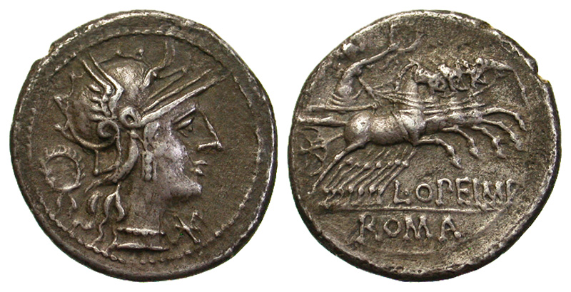 L. Opimius Q.f.. 131 B.C. AR denarius (19.3 mm, 3.71 g, 0 h). Rome. Helmeted head of Roma right; wreath behind, monogram below chin / LĀ·OPEIMI / ROMA, Victory driving galloping quadriga right, holding reins and wreath. Crawford 253/1; Sydenham 473; RSC Opimia 12. VF, toned.