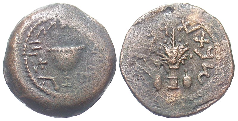 Lot 18-047. First Jewish War. 66-70 C.E. Æ eighth shekel. Year 4 = C.E. 69/70.