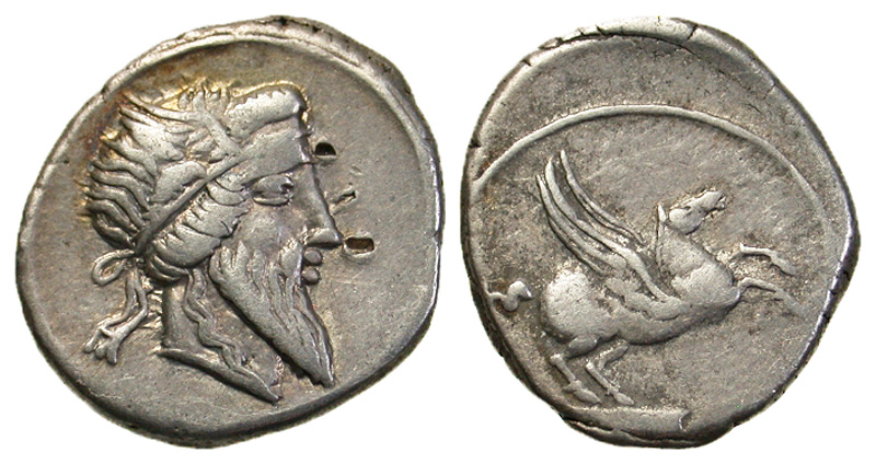 Q. Titius. 90 B.C. AR denarius (18.9 mm, 3.81 g, 4 h). Rome. Bearded bust of Mutinus titinus right, wearing winged diadem / Q·TITI, Pegasus springing right from tablet. Crawford 341/1; Sydenham 691; RSC Titia 1. aVF, reverse off center.
